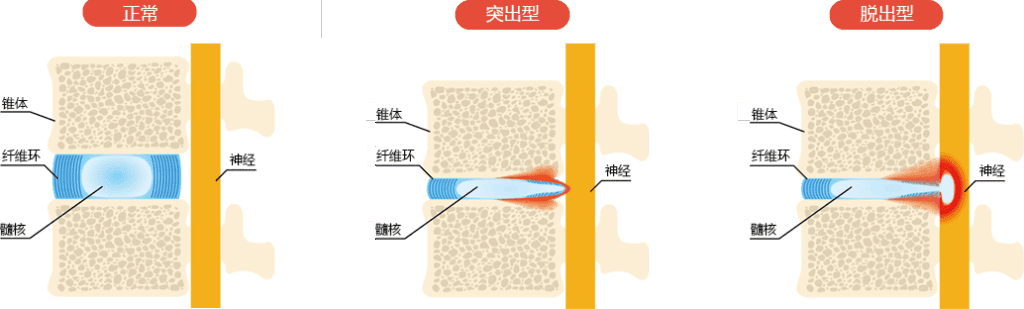 所谓椎间盘突出症,是指纤维环出现裂缝,髓核从中突出到外部的状态。